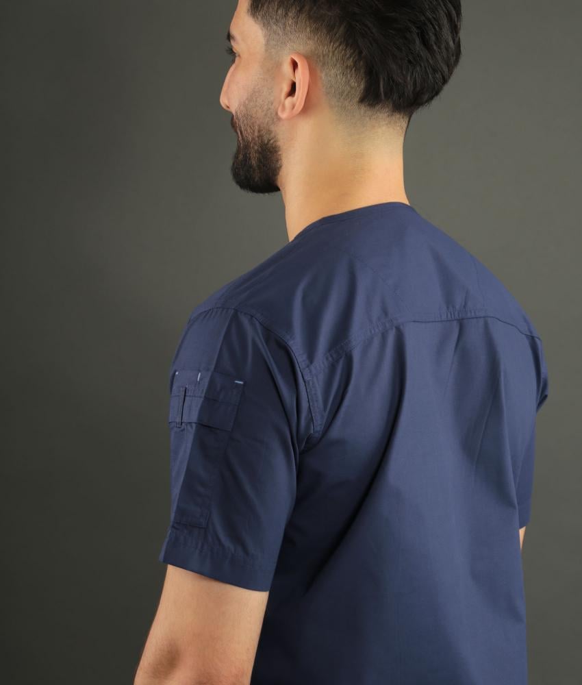 • تصميم القميص: تصميم واسع بأكمام قصيرة وجيوب أمامية على الصدر لتخزين الأدوات ورقبة على شكل حرف V